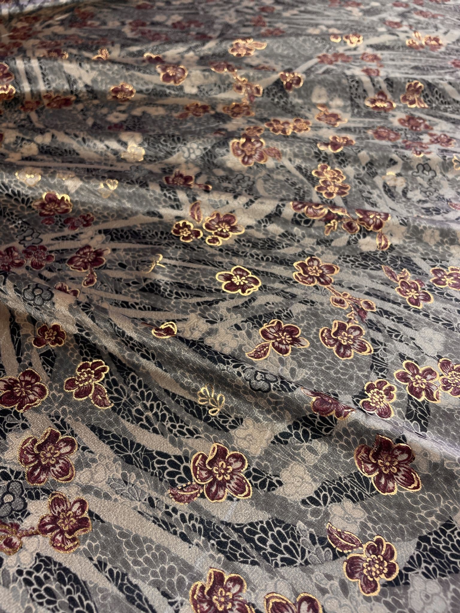 Home View more images Product Description Luxurious stretch velvet fabric with delicate florals and gold detailing that catch the light beautifully and shimmer as it moves. In low light the gold glitters while in brighter light the colours pop Fabric type: Stretch Velvet Colour/Design: Grey with Pink Floral and Gold Stretch Polyester Velvet Options: Green, Pink, Yellow, Grey, Material composition: 100% Polyester Width: 150cm Usage examples: Dress making/apparel, lightweight jackets, drapery Please note: All fabric is cut to order and supplied in one continuous length. If you are unsure of the fabric choice, please order a sample first. Images: We try to produce accurate fabric images however colours can vary slightly when photographed and when viewed on different screens. If you are unsure please order a sample first. Specifications Material Polyester Width 150cm Colour Grey Design Floral / Plants / Fruit Product Code STRVEL-3 Weight 0.05kg Customer reviews No reviews left yet Write A Review Most RecentTop Rated Delivery & Returns Refunds & Returns We would rather you not return fabric we have cut to your required length so we would encourage you to order a sample first to make sure you are happy with your fabric choice.However, if you are not entirely satisfied with the fabric you have purchased through our website, you may return it to us within 14 days of receipt for a refund as long as the fabric is in its original condition and in its original length. ie; not cut further by the customer. Note: The refund excludes the initial postage cost.Returns should be sent back to the address below along with your name and order number. Buyer pays the cost to return the fabric.If there has been an error with your order or your fabric is damaged we will of course pay the postage costs for your order to be returned. Please contact us via email and we will send you a pre-paid label. Customer Reviews Grey with Pink Florals and Gold Stretch Polyester Velvet Item in Stock (30 Available) Product Code STRVEL-3 Size By The Metre Sample £8.99