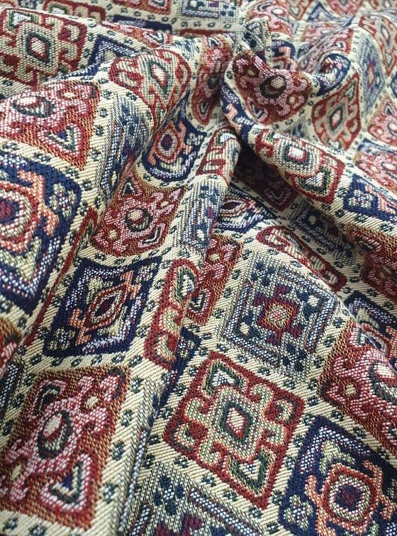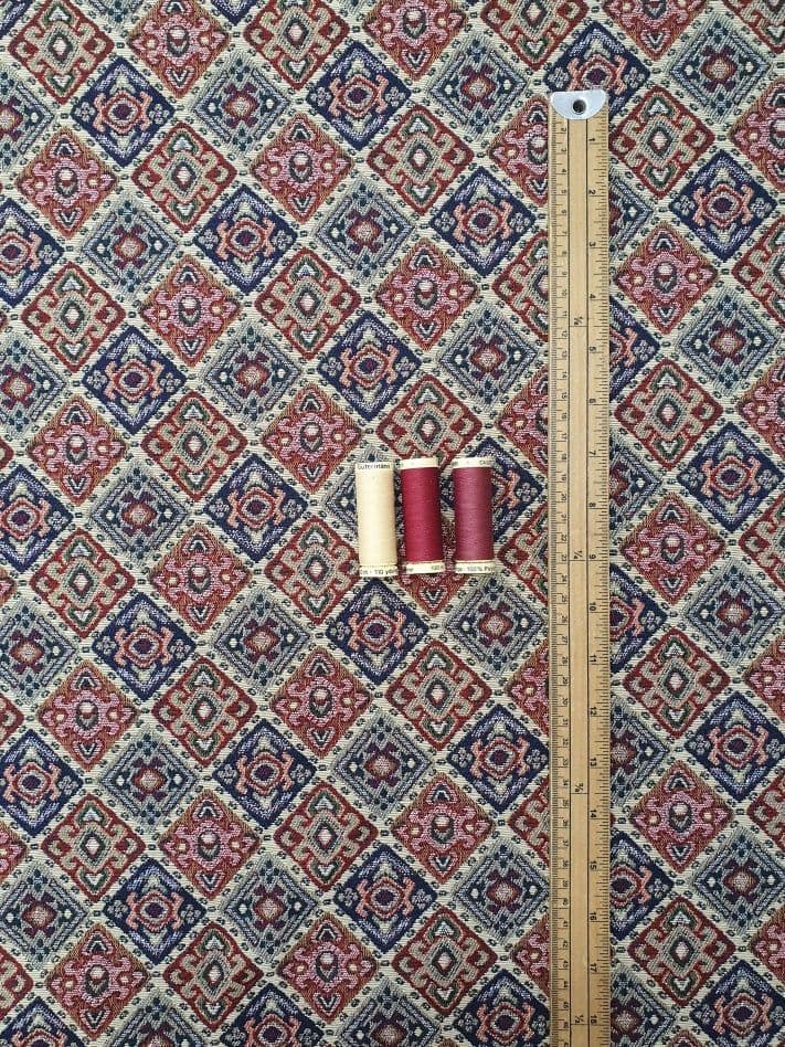 Home / Patterns Product Description Description Mini Persian Tapestry : A bold traditional design with rich reds, burgandy, green and navy accents on a pale beige background. Perfect to add an authentic twist to your interior. Heavyweight fabric perfect for curtains, upholstery and soft furnishings. Colour / Design: MINI PERSIAN TAPESTRY/ PALE Composition: 55% COTTON 45% POLYESTER Width: 140cm Martindale Rub Test: Approx 20,000 Care Instructions: COOL WASH, COOL IRON Images We try to produce accurate images but the fabric colours can vary from screen to screen. If you are unsure please order a sample first. Click image to see a high resolution version. Samples / Images We try to produce accurate fabric images however colours can vary slightly when photographed and when viewed on different screens. If you are unsure please order a sample first. Specifications Design Geometric Product Code 3034 Weight 0.6kg Customer reviews No reviews left yet Write A Review Most RecentTop Rated Delivery & Returns Refunds & Returns We would rather you not return fabric we have cut to your required length so we would encourage you to order a sample first to make sure you are happy with your fabric choice.However, if you are not entirely satisfied with the fabric you have purchased through our website, you may return it to us within 14 days of receipt for a refund as long as the fabric is in its original condition and in its original length. ie; not cut further by the customer. Note: The refund excludes the initial postage cost.Returns should be sent back to the address below along with your name and order number. Buyer pays the cost to return the fabric.If there has been an error with your order or your fabric is damaged we will of course pay the postage costs for your order to be returned. Please contact us via email and we will send you a pre-paid label. Customer Reviews Tapestry Fabric for Curtaining or Upholstery: Mini Persian on pale beige background Item in Stock (8 Available) Product Code 3034 Please Select Required Length SAMPLE METRE £15.99