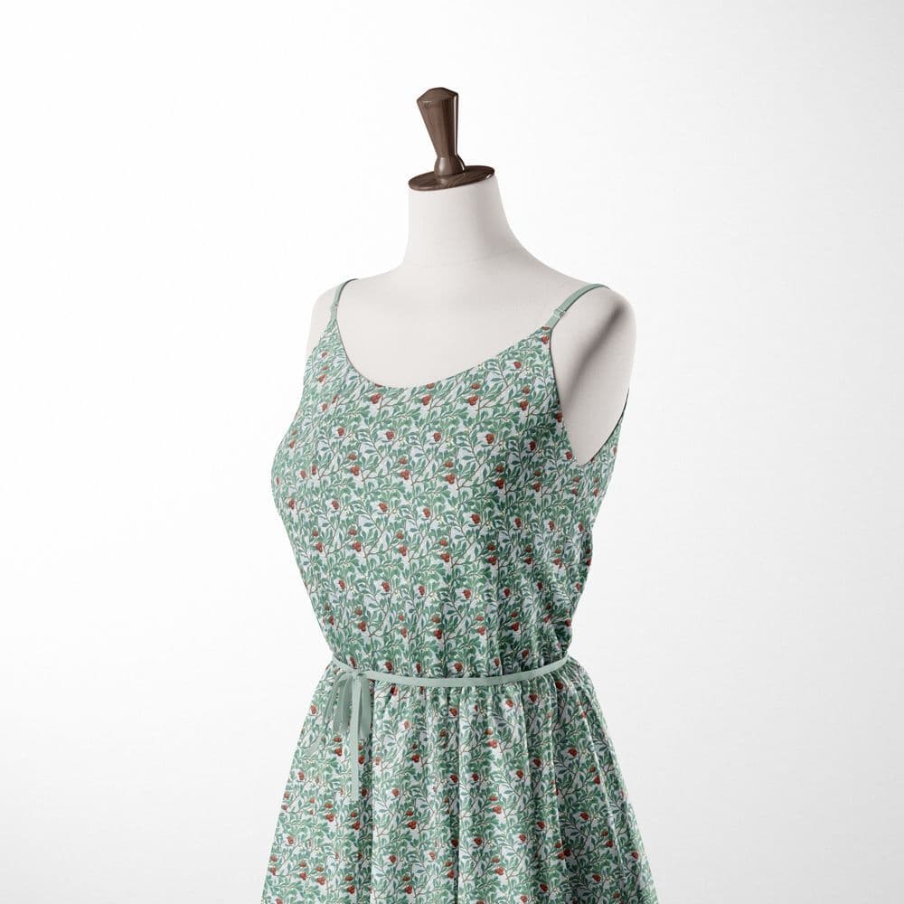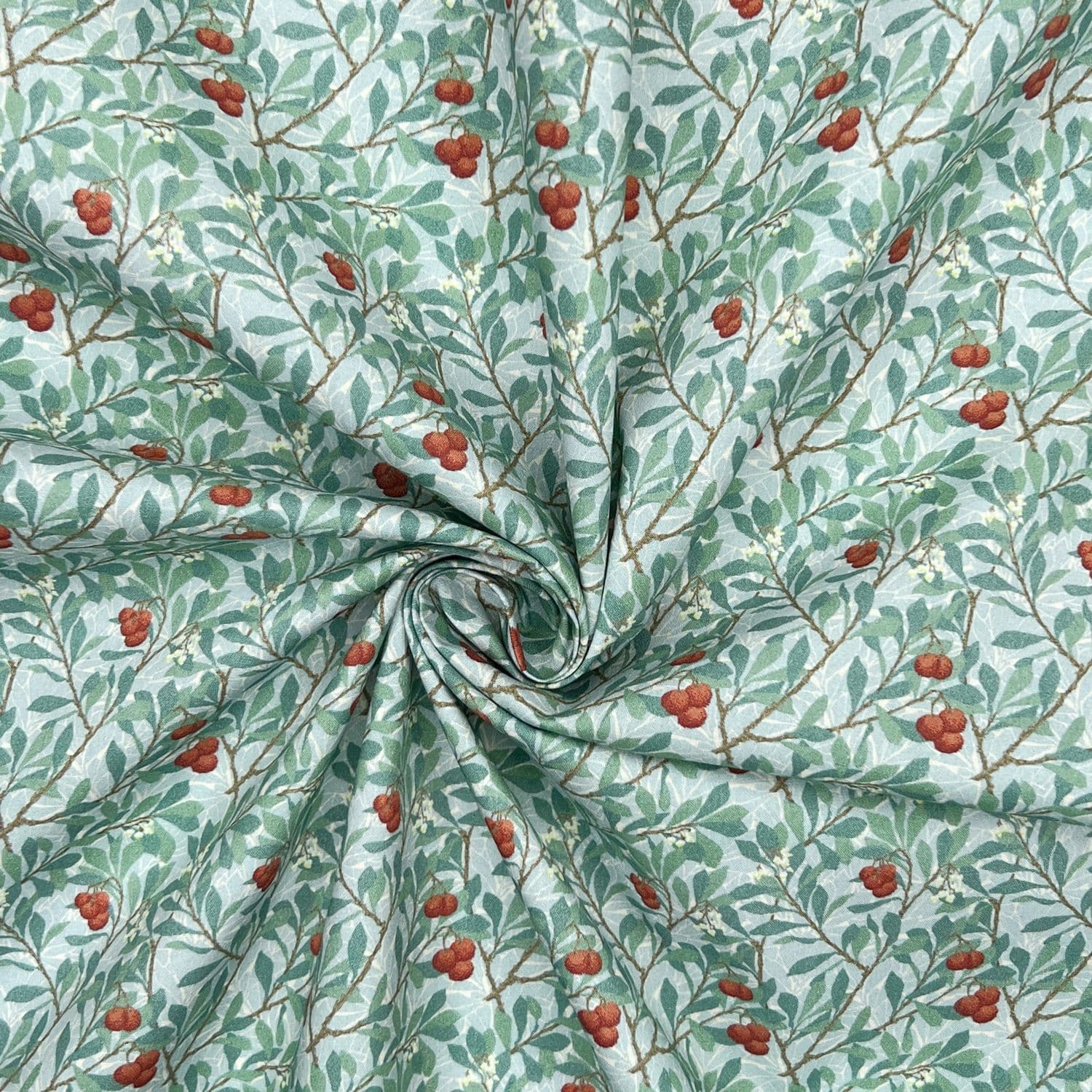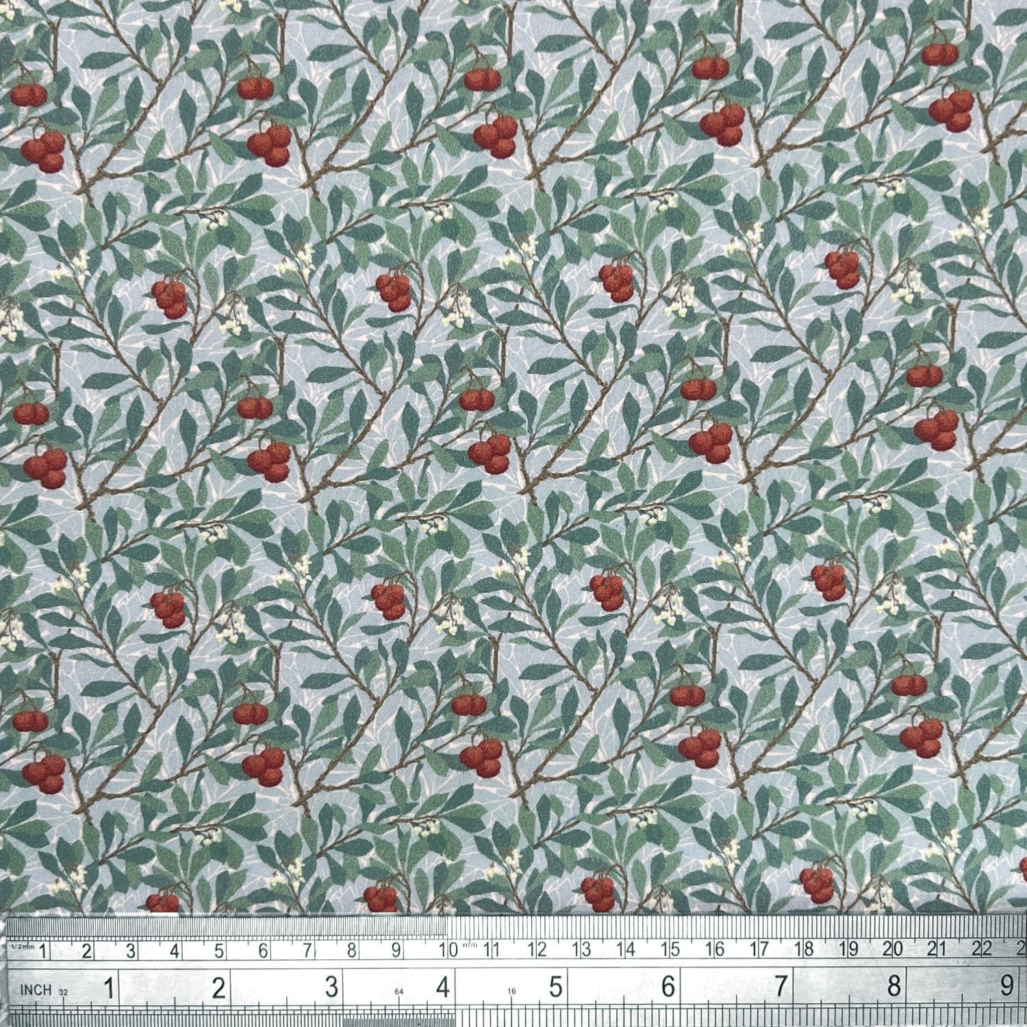 Home / Fabric Uses / Dress Fabrics Product Description Arbutus Design 100% Cotton Fabric with OEKO-Tex Confidence in Textiles Standard 100 Certification. This William Morris Poplin Craft fabric has Sage Green leaves and Crimson berries as the main design, with a tranquil blue-grey background/ The design is fairly small therefore creates a ditsy print. This fabric is digitally printed onto a premium 200 thread Count 100% Pure Cotton Fabric. The Cotton is Oeko Tested and uses reactive dyes so can be washed at a higher temperature without compromising the quality of the fabric. It has a GSM of 125 and with its beautiful flowing softness it has a wide range of usages from Fashion, Patchwork and a variety of Crafting ideas. Fabric type: 100% Cotton Dressmaking Craft Fabric Colour/Design: Arbustus / Cranberry & Green on Pale Blue Material composition: 100% Cotton Width: 115cm / 45" GSM: 125 Usage examples: Dress making/apparel, lightweight jackets, drapery Please note: All fabric is cut to order and supplied in one continuous length. If you are unsure of the fabric choice, please order a sample first. Images: We try to produce accurate fabric images however colours can vary slightly when photographed and when viewed on different screens. If you are unsure please order a sample first. Specifications Design Plants & Florals Width 114cm Product Code 4413 Weight 0.35kg Customer reviews No reviews left yet Write A Review Most RecentTop Rated Delivery & Returns Refunds & Returns We would rather you not return fabric we have cut to your required length so we would encourage you to order a sample first to make sure you are happy with your fabric choice.However, if you are not entirely satisfied with the fabric you have purchased through our website, you may return it to us within 14 days of receipt for a refund as long as the fabric is in its original condition and in its original length. ie; not cut further by the customer. Note: The refund excludes the initial postage cost.Returns should be sent back to the address below along with your name and order number. Buyer pays the cost to return the fabric.If there has been an error with your order or your fabric is damaged we will of course pay the postage costs for your order to be returned. Please contact us via email and we will send you a pre-paid label. Customer Reviews William Morris Arbutus - 100% Cotton Dressmaking Craft Fabric Item in Stock (109 Available) Product Code 4413 Please Select Required Length By The Metre Sample £14.95