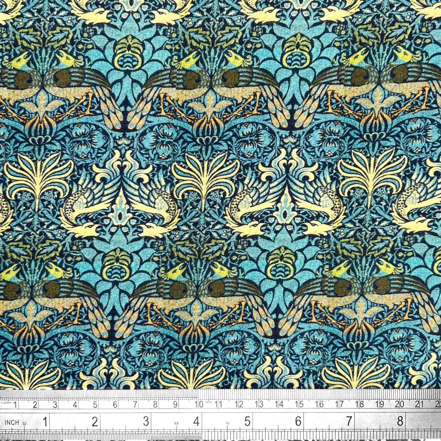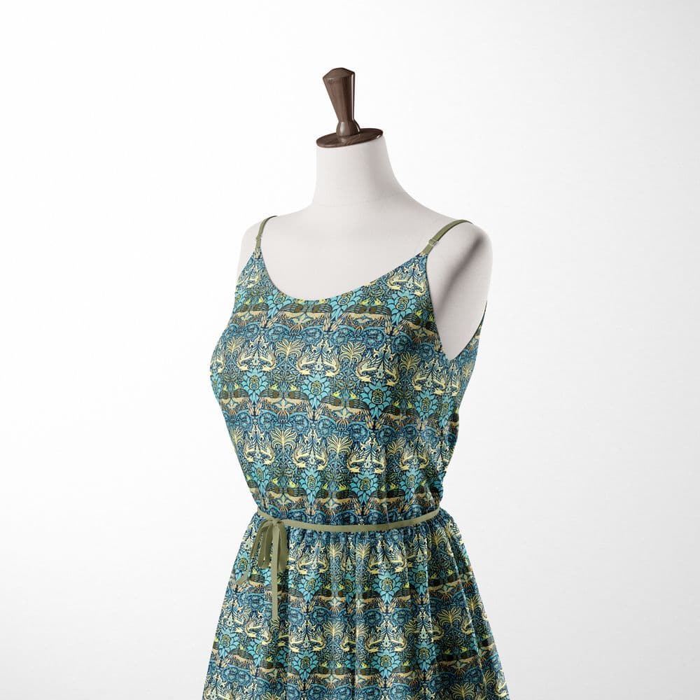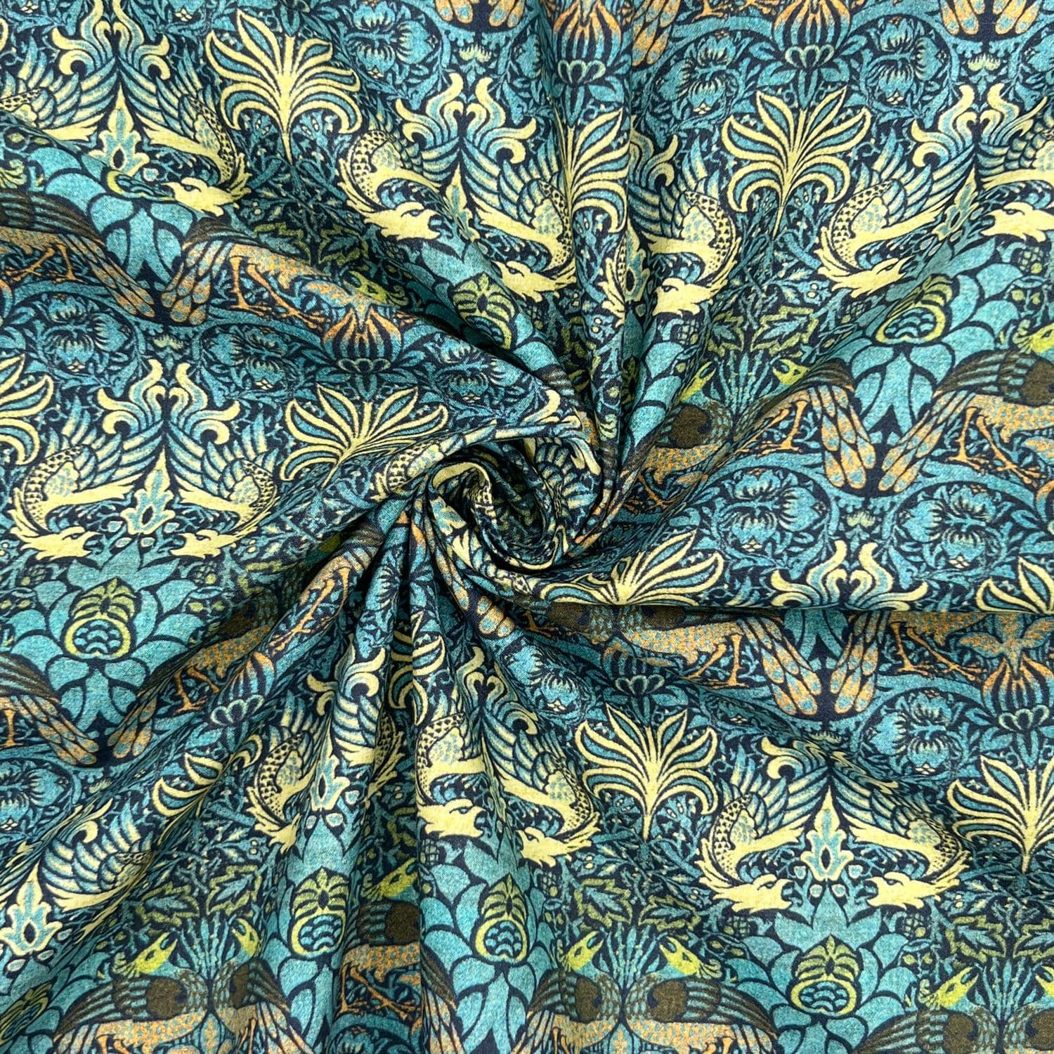 Home / Fabric Uses / Craft and Quilting Product Description From the William Morris Collection, Peacock & Dragon Cotton fabric with a Yellow & Turquoise Interlocking motif Navy Blue design on Teal. This fabric has received the OEKO-TEX Confidence in Textiles Standard 100 Certification. This fabric is digitally printed onto a premium 200 thread Count 100% Pure Cotton Fabric. The Cotton is Oeko Tested and uses reactive dyes so can be washed at a higher temperature without compromising the quality of the fabric. It has a GSM of 125 and with its beautiful flowing softness it has a wide range of usages from Fashion, Patchwork and a variety of Crafting ideas. Fabric type: 100% Cotton Dressmaking Craft Fabric Colour/Design: Peacock & Dragon / Yellow & Turquoise on Navy Material composition: 100% Cotton Width: 115cm / 45" GSM: 125 Usage examples: Dress making/apparel, lightweight jackets, drapery Please note: All fabric is cut to order and supplied in one continuous length. If you are unsure of the fabric choice, please order a sample first. Images: We try to produce accurate fabric images however colours can vary slightly when photographed and when viewed on different screens. If you are unsure please order a sample first. Specifications Design Animal Product Code 4414 Weight 0.35kg Customer reviews No reviews left yet Write A Review Most RecentTop Rated Delivery & Returns Refunds & Returns We would rather you not return fabric we have cut to your required length so we would encourage you to order a sample first to make sure you are happy with your fabric choice.However, if you are not entirely satisfied with the fabric you have purchased through our website, you may return it to us within 14 days of receipt for a refund as long as the fabric is in its original condition and in its original length. ie; not cut further by the customer. Note: The refund excludes the initial postage cost.Returns should be sent back to the address below along with your name and order number. Buyer pays the cost to return the fabric.If there has been an error with your order or your fabric is damaged we will of course pay the postage costs for your order to be returned. Please contact us via email and we will send you a pre-paid label. Customer Reviews William Morris Peacock & Dragon - 100% Cotton Dressmaking Craft Fabric Item in Stock (13 Available) Product Code 4414 Please Select Required Length By The Metre Sample £14.95