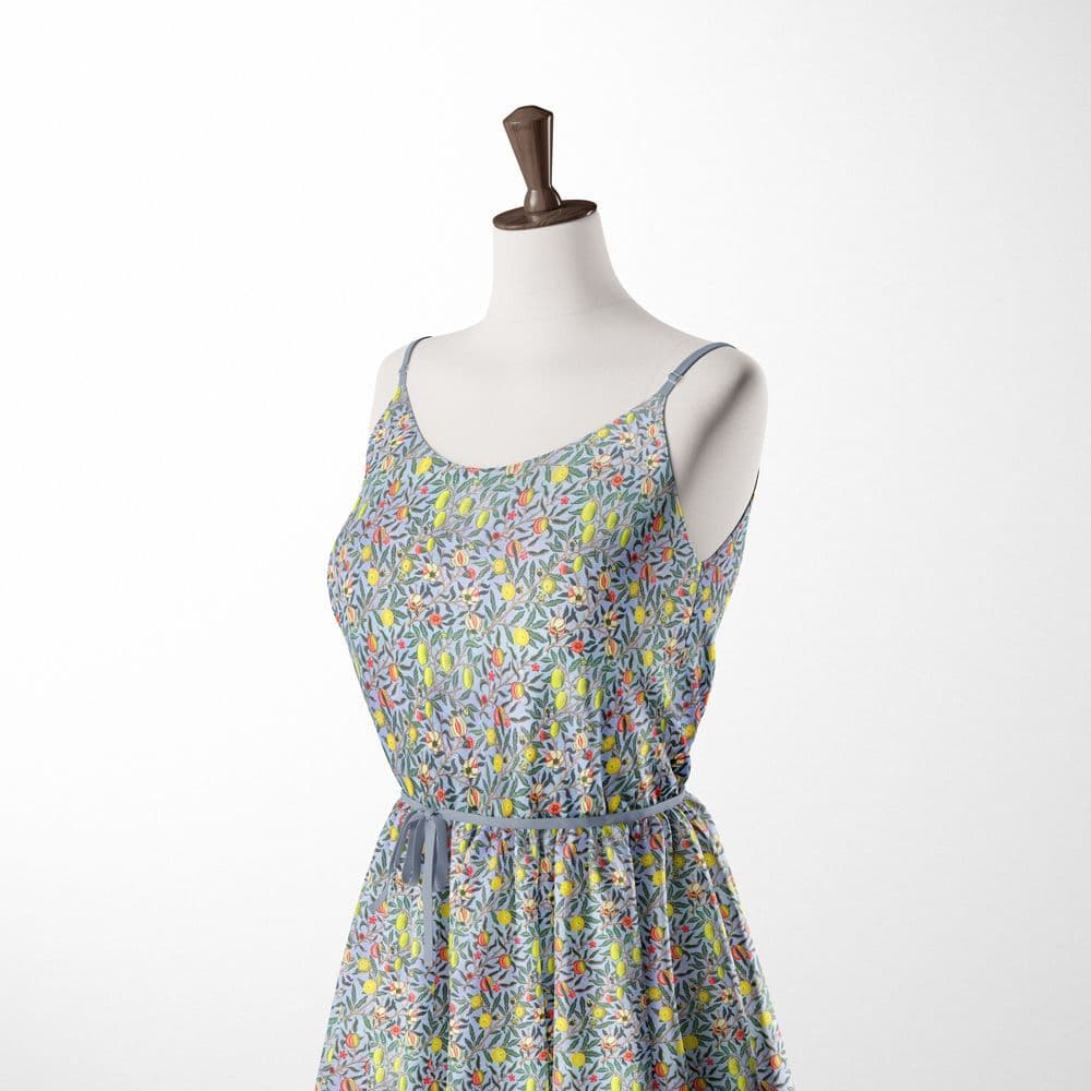Home / Fabric Uses / Dress Fabrics Product Description Pomegranates on Blue Design 100% Cotton Fabric with OEKO-Tex Confidence in Textiles Standard 100 Certification. Fabric type: 100% Cotton Dressmaking Craft Fabric Colour/Design: Multi-Colour Pomegranates on Blue Material composition: 100% Cotton Width: 115cm / 45" GSM: 125 Usage examples: Dress making/apparel, lightweight jackets, drapery Please note: All fabric is cut to order and supplied in one continuous length. If you are unsure of the fabric choice, please order a sample first. Images: We try to produce accurate fabric images however colours can vary slightly when photographed and when viewed on different screens. If you are unsure please order a sample first. Specifications Design Fruit Product Code 4401 Weight 0.35kg Customer reviews No reviews left yet Write A Review Most RecentTop Rated Delivery & Returns Refunds & Returns We would rather you not return fabric we have cut to your required length so we would encourage you to order a sample first to make sure you are happy with your fabric choice.However, if you are not entirely satisfied with the fabric you have purchased through our website, you may return it to us within 14 days of receipt for a refund as long as the fabric is in its original condition and in its original length. ie; not cut further by the customer. Note: The refund excludes the initial postage cost.Returns should be sent back to the address below along with your name and order number. Buyer pays the cost to return the fabric.If there has been an error with your order or your fabric is damaged we will of course pay the postage costs for your order to be returned. Please contact us via email and we will send you a pre-paid label. Customer Reviews William Morris Pomegranate Blue - 100% Cotton Dressmaking Craft Fabric Item in Stock (109 Available) Product Code 4401 Please Select Required Length By The Metre Sample £14.95
