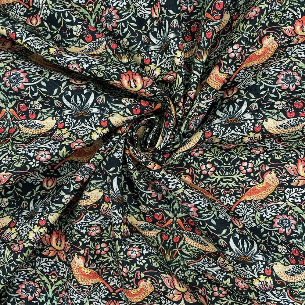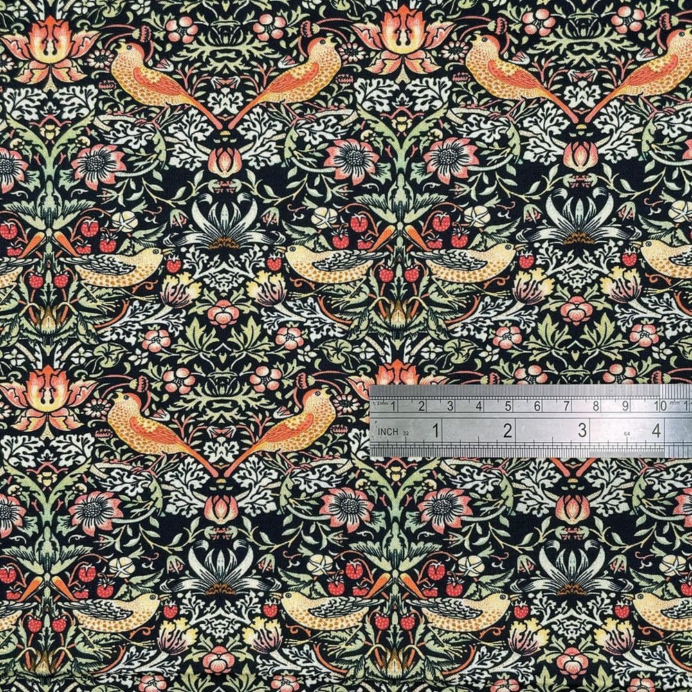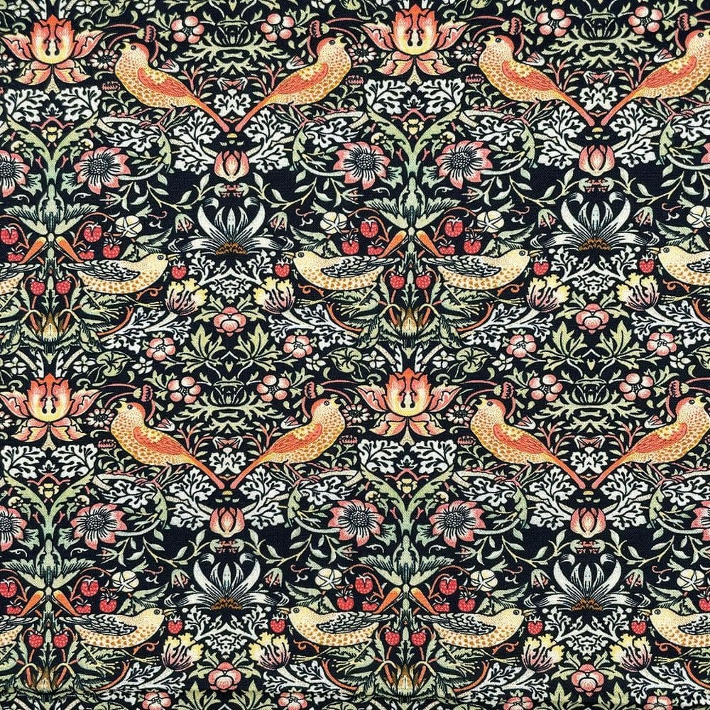 Home / Themes / Animals Product Description Strawberry Thief is inspired by the iconic designs by William Morris, with the thrush bird as the subject. This beautiful cotton is of a high quality and versatile. Fabric type: 100% Cotton Dressmaking Craft Fabric Colour/Design: Orange Birds on Navy/ Black Cotton Quilting Dressmaking Fabric Material composition: 100% Cotton Width: 115cm / 45" GSM: 125 Usage examples: Dress making/apparel, lightweight jackets, drapery Please note: All fabric is cut to order and supplied in one continuous length. If you are unsure of the fabric choice, please order a sample first. Images: We try to produce accurate fabric images however colours can vary slightly when photographed and when viewed on different screens. If you are unsure please order a sample first. Specifications Design Animal Product Code 353 Weight 0.35kg Customer reviews No reviews left yet Write A Review Most RecentTop Rated Delivery & Returns Refunds & Returns We would rather you not return fabric we have cut to your required length so we would encourage you to order a sample first to make sure you are happy with your fabric choice.However, if you are not entirely satisfied with the fabric you have purchased through our website, you may return it to us within 14 days of receipt for a refund as long as the fabric is in its original condition and in its original length. ie; not cut further by the customer. Note: The refund excludes the initial postage cost.Returns should be sent back to the address below along with your name and order number. Buyer pays the cost to return the fabric.If there has been an error with your order or your fabric is damaged we will of course pay the postage costs for your order to be returned. Please contact us via email and we will send you a pre-paid label. Customer Reviews William Morris Strawberry Thief Ebony - 100% Cotton Dressmaking Craft Fabric Item in Stock (109 Available) Product Code 353 Please Select Required Length By The Metre Sample £14.95